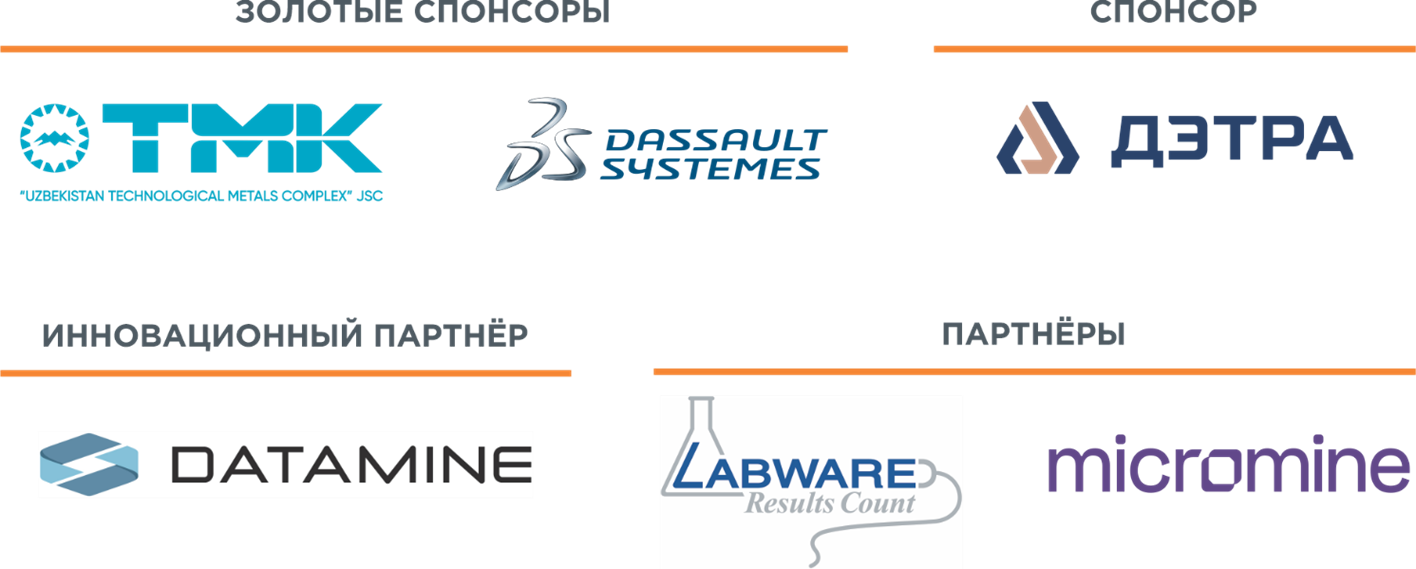 В этом году форум поддержали Золотые спонсоры - АО «Узбекский комбинат технологических металлов» (УзТМК) и Dassault Systèmes, Спонсор - ДЭТРА, Инновационный партнер – Datamine, а также Партнеры – LabWare и Micromine.